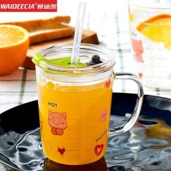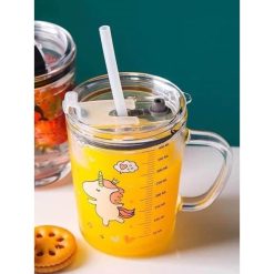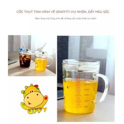 Cốc thủy tinh chia vạch 350ml có ống hút silicon đi kèm, rất mềm mại và an toàn khi tiếp xúc trực tiếp với miệng trẻ.