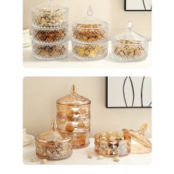 - Thố thủy tinh 3 tầng đựng mứt, hạt khô có hai phiên bản cho bạn chọn lựa: trong suốt và vàng đồng